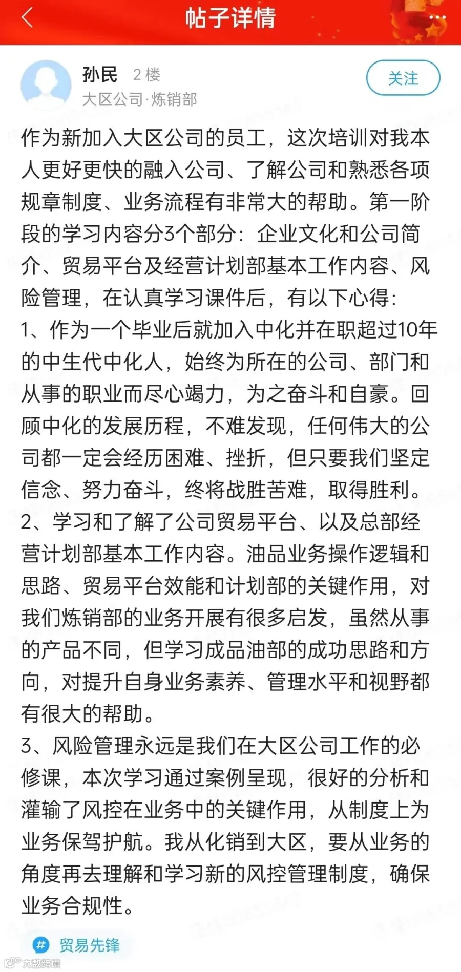 为全面匹配石油销售公司“自营+平台+服务”战略,深入践行“全过程”人才培养理念,“贸易先锋”培养项目于2022年1月如期开展。