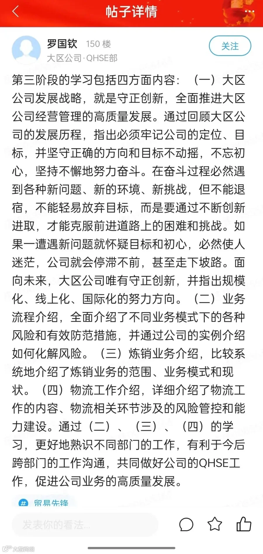本次培训以大区公司为依托,重点打造营销服务、人员素养、成本管理、信息化、持续创新等“新五大能力”建设。3月6日,“贸易先锋”培养项目正式结项。历时两个月,依托“未来学苑”学习平台完成,分四个阶段进行,共75名学员参加培训,以组为单位开展学习,完成11门线上课程学习、分享和考核任务。项目共计收获学习感悟分享200余条,发帖点赞超1000个,在线学习时长累计近1450小时,通过线上线下融合多举措推动培训落地,高质量完成各项培训安排,取得预期培训效果。
