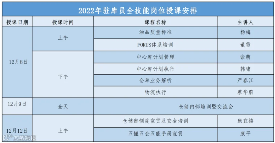 本次驻库全技能专项培训分两阶段进行,第一阶段培训内容为油品质量标准、FORUS体系培训、中心库计划管理、中心库计划执行、仓单业务解析、物流执行等业务工作的介绍。第二阶段培训内容为仓储部内部相关工作内容的介绍及部门制度、五懂五会五能手册的宣贯。培训讲师由销售公司中级认证讲师康平、大区公司认证讲师杨梅、蔡华蔚及各部门优秀员工组成,讲授相关专业知识和自身经验的传授,培训共设置了8门核心课程。培训结束后参训人员就学习体会进行了深入的交流。