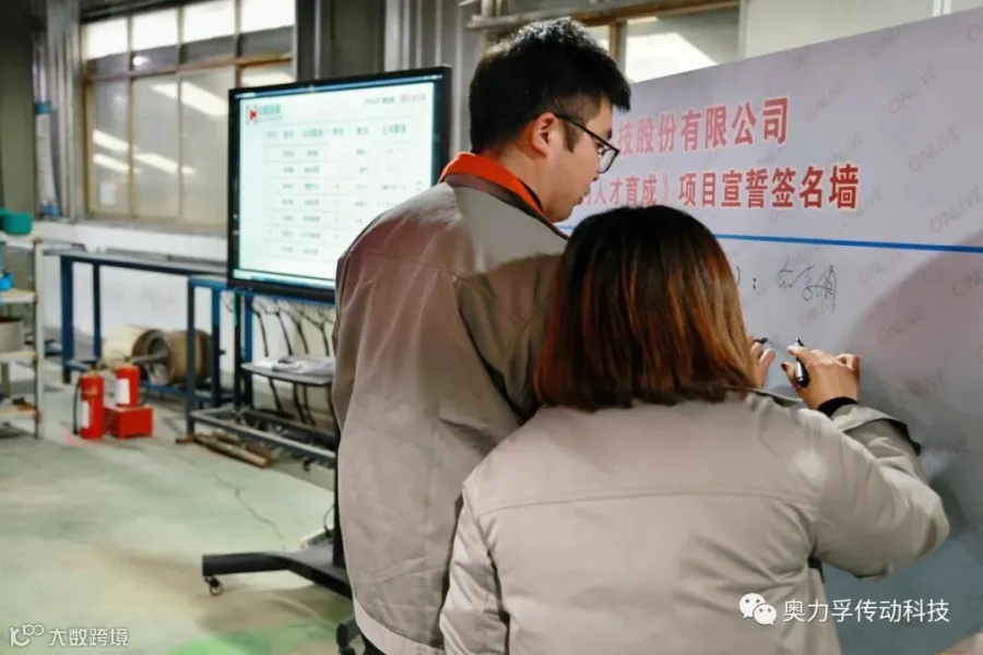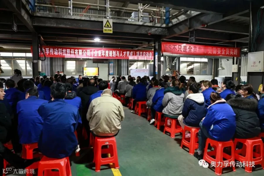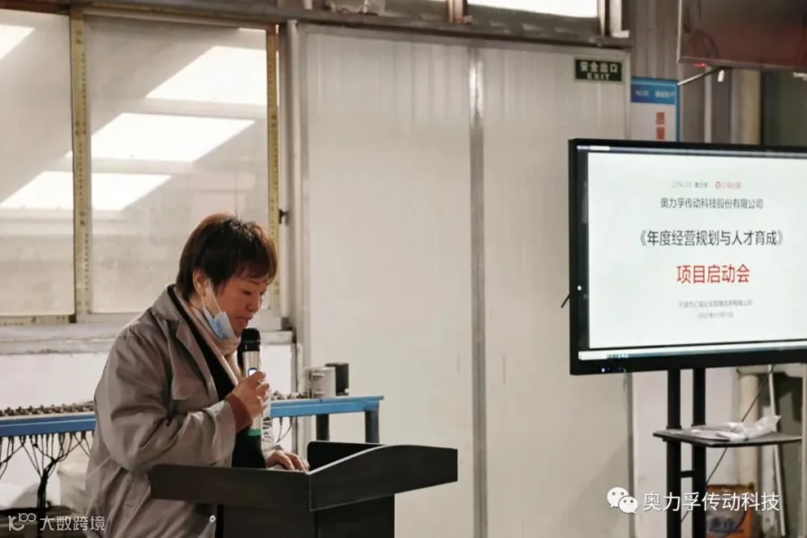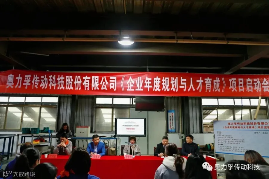 2021年3月7日下午16:00整,奥力孚传动科技股份有限公司全体职工于开口带车间召开《企业年度规划与人才育成》项目启动大会。出席本次会议的领导和嘉宾有:奥力孚传动科技股份有限公司总经理俞素娟女士、副总经理何国鑫先生;宁波汇成企业管理咨询有限公司创始人任鑫苗先生,项目组谭昭平老师、戴君波老师。