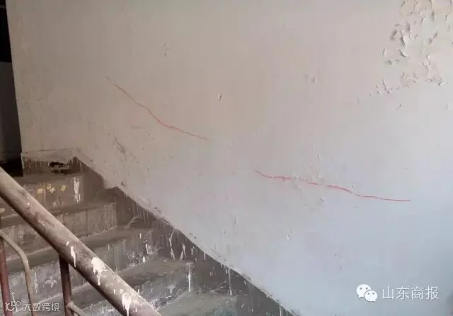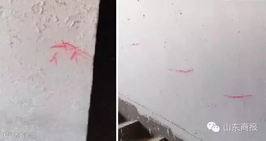 昨天上午,记者在该单元楼看到,一层楼梯左右两侧都有红色的字迹,看上去像是文字的偏旁,还有涂改的痕迹。在二楼至六楼,楼道一侧的墙壁上画的是红色横线,有的地方则是间断的三条线。记者又进入旁边的单元,并没有发现这样的符号。