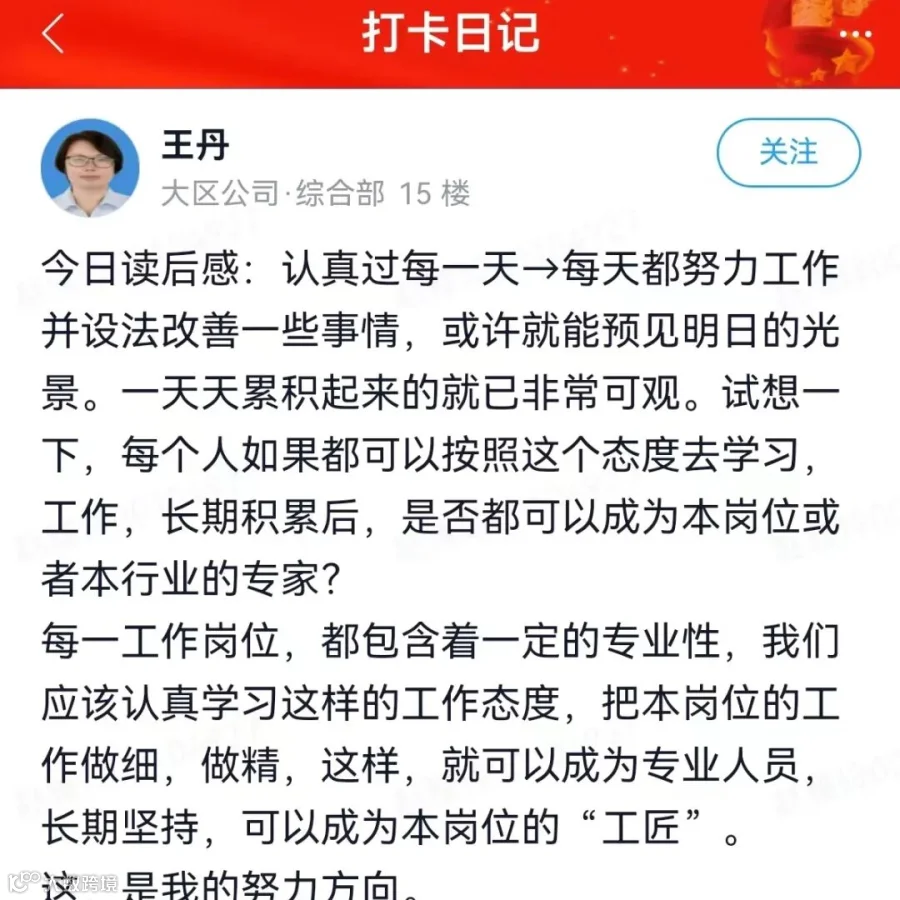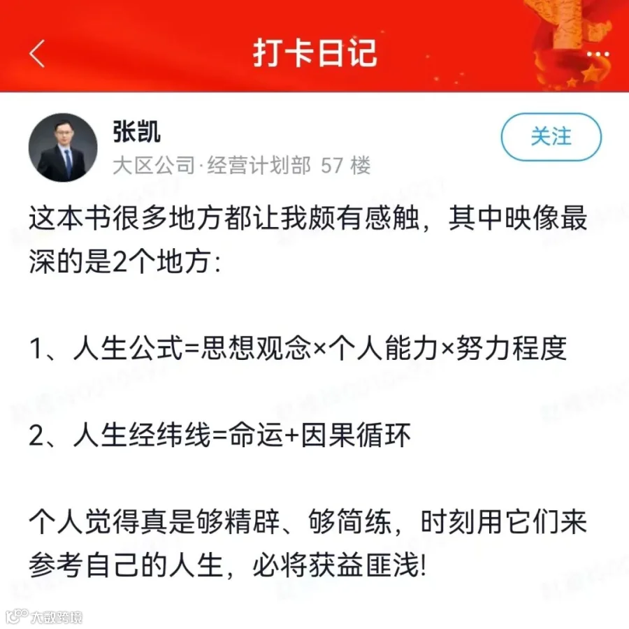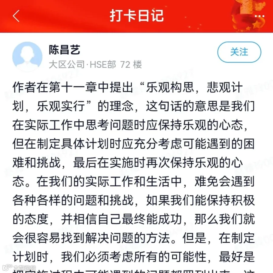 成功的方程式=能力X努力X态度,态度是这三个因素中最重要的,决定了一个人的定位和走向,对我触动最深的是态度这一部分,从自身工作角度我把态度理解为合规和把控风险,再结合自身的工作以及近期上级公司的一系列关系要求,在企业的经营中一切都是需要合规,只有在合规的前提下,才能防范规避风险,保障企业稳健经营。