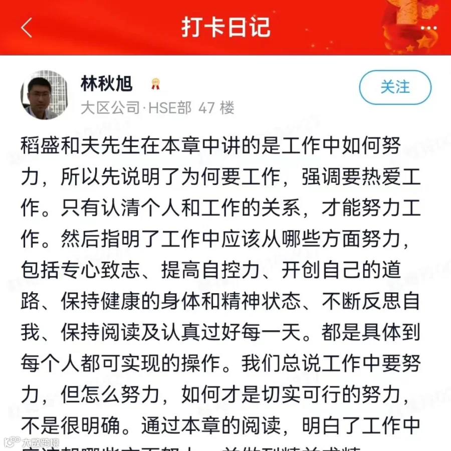 对于企业成功之道稻盛和夫先生在书中做了归纳:热情(passion)就是成功之钥。不论是企业经营之道还是中层干部追求卓越之道,均离不开热情。在当前外部环境复杂多变的大背景下,作为中层干部我们更需要坚定理想信念,怀揣干事创业的热情,将个人绩效目标与公司的年度战略目标统一起来。在公司要当好表率,发挥正向的影响力,做好承上启下的桥梁和枢纽,当好领导和员工之间的纽带。