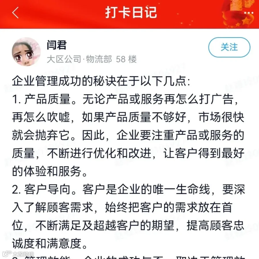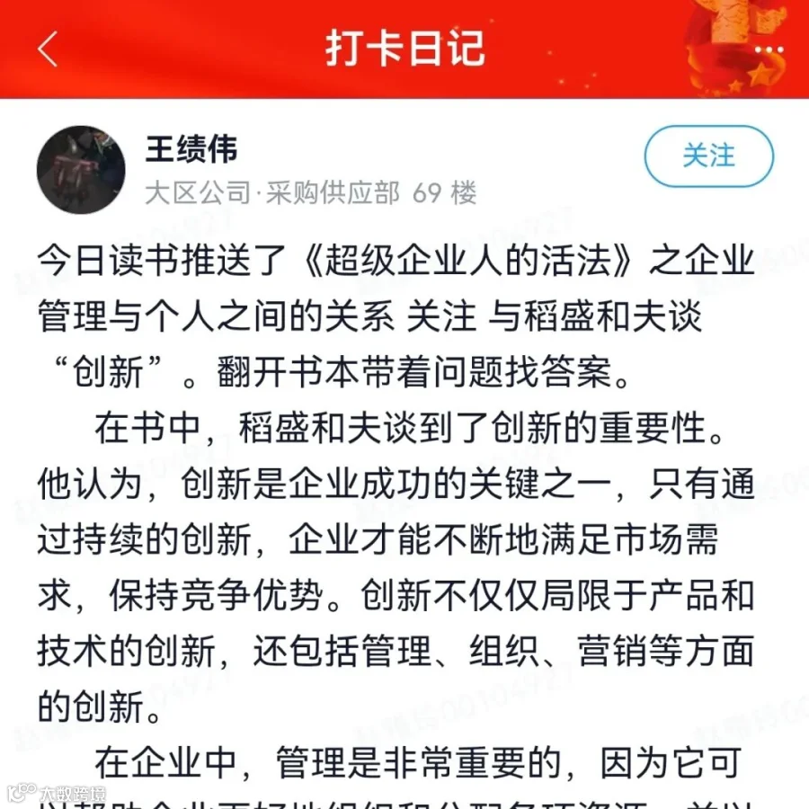 针对学习计划安排的三个阶段核心内容,中层干部围绕领导力、战略规划、团队管理等精彩内容展开线上好书解读,利用未来学苑平台每日发布读书打卡笔记,并建立微信打卡交流群,学员们在群里展开互动讨论。学员们结合工作实际,把自己摆进去、把职责摆进去、把工作摆进去,学思践悟,互动交流。