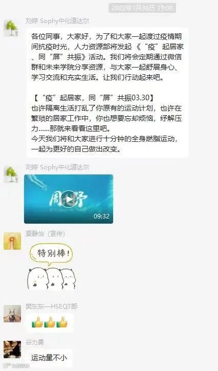 与此同时,中化上海石油工会启动了“工会送温暖”活动,安排专人通过电话、视频等方式针对专班职工、青年职工等不同群体开展专线关爱计划。TSO工会、大区公司工会也不定期在沟通群发布瑜伽、EAP等课程,缓解疫情期间居家隔离的枯燥和压力。
