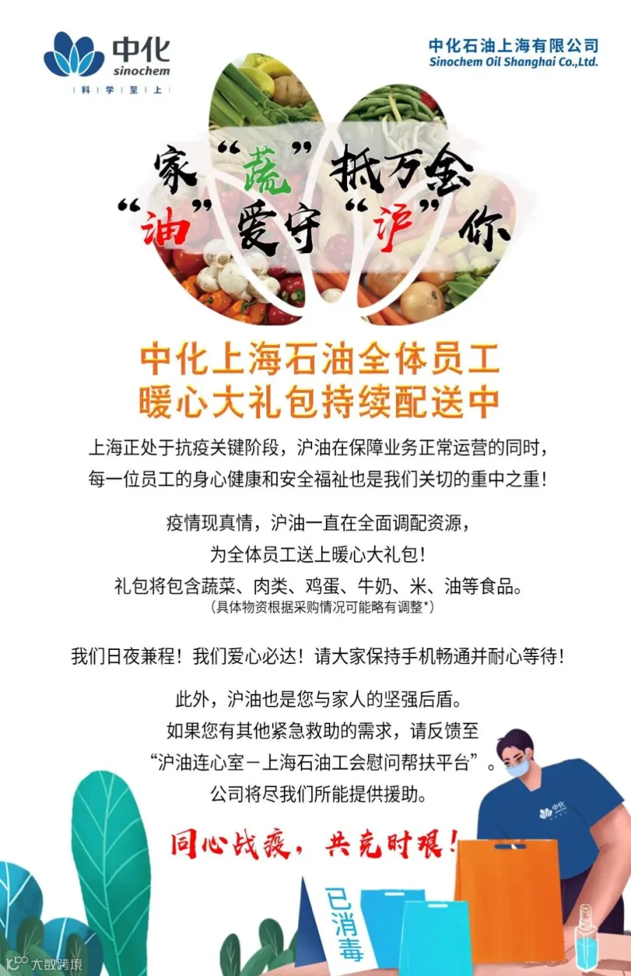 这些天,中化石油销售在上海的员工们陆续收到了来自公司的“抗疫暖心大礼包”,礼包内有主食、蔬菜、食用油、奶制品、肉品等,这些生活用品对于尚在封闭管理期、面临资源紧缺和运输有限的员工们而言,是惊喜更是力量。