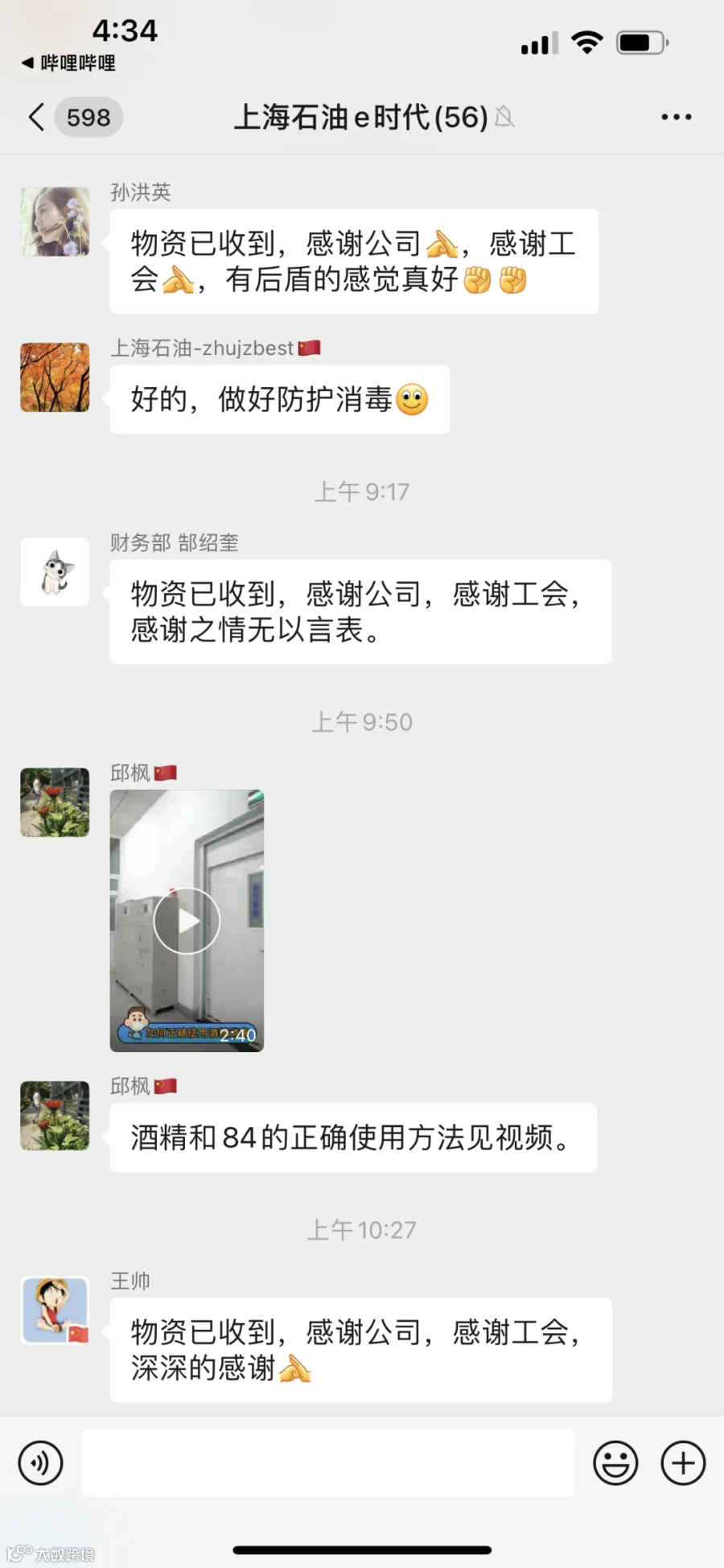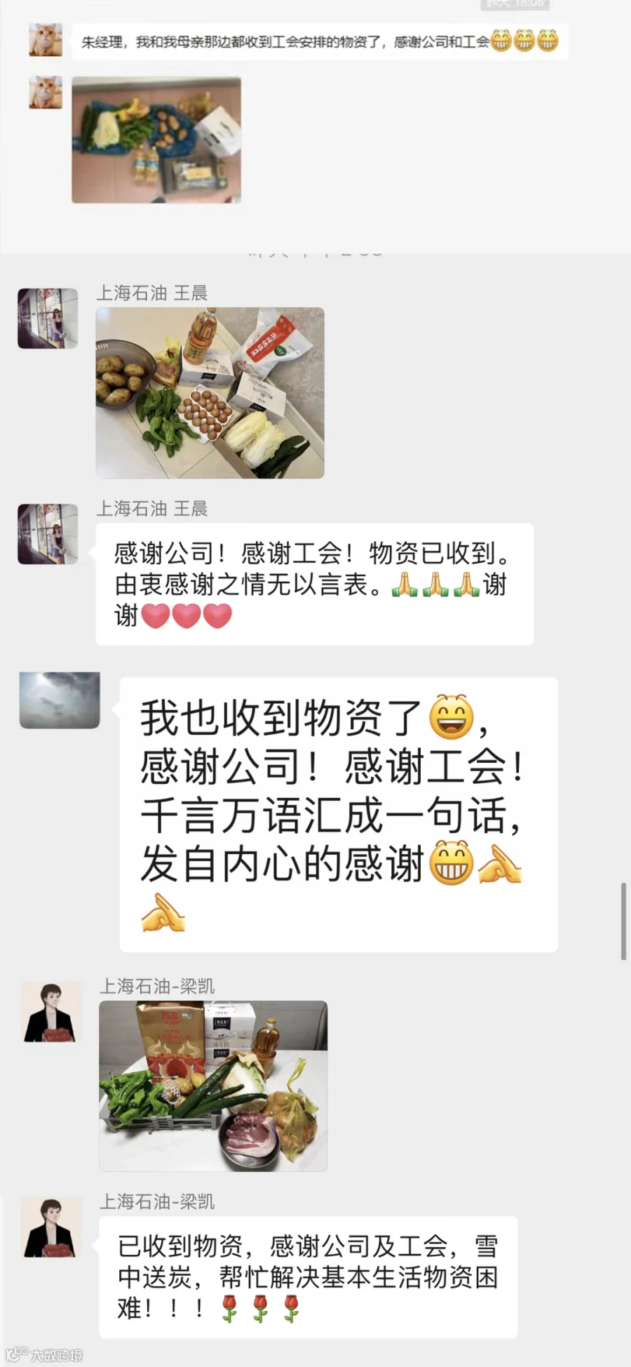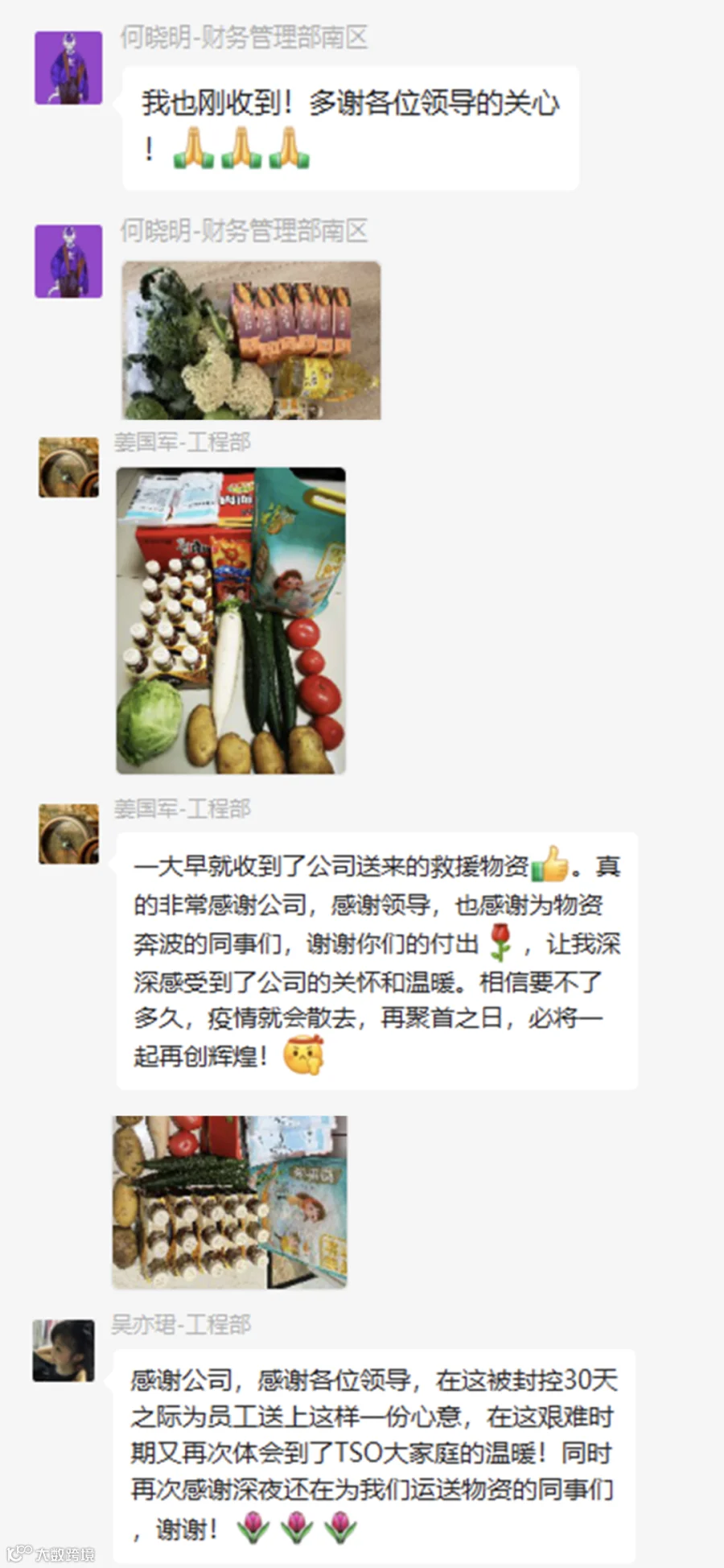 “收到了公司的物资,有种得救了的感觉,疫情无情人有情,感谢公司领导的关心,感谢相关部门同事的用心,让我感受到了来自集体的温暖。”