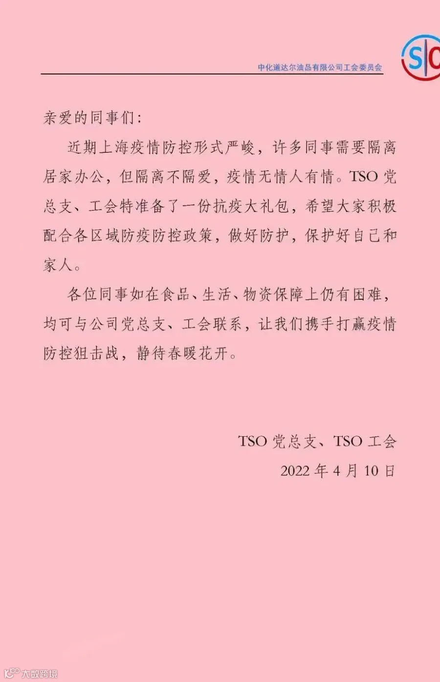 病毒可以把我们隔离,但温暖不会被隔离。就像公司在千难万险中寄来的一份爱心礼包,传递的不止是一份温暖和牵挂,更是一份盼望和力量。疫情当前,有党员主动亮身份、冲一线,用无私奉献诠释时代担当;有青年志愿者逆行而上,用志愿精神点亮青春梦想;有“最美妈妈”们舍小家为大家,在一线岗位上发光发热;也有时刻与疫情赛跑的“大白”,为这个疫情“倒春寒”增添一丝丝希望。如今手捧这一份来之不易的物资,感受到的不仅是上级组织的温情,更是整个城市在逆流中毫不松懈、坚持运转的力量。我相信,在不远的春日里,我们终会在春风里相见,上海加油!