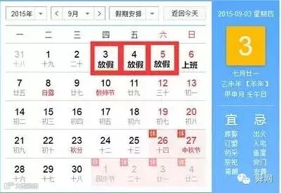 9月3日至5日(周四至周六)调休放假,就这么开心的多了一个小长假~如果9月3日悲惨的要上班的话,也是可以申请补休的哦,要是不补休,也不差,可以拿到双倍工资!