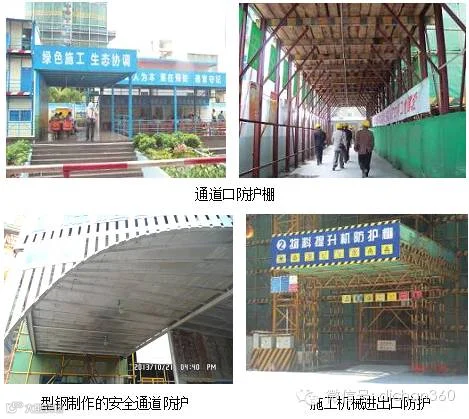 • 主体结构施工自二层起,凡人员出入的通道口,均应搭设安全防护棚,安全通道的防护棚宽度不少于2m,顶部双层防护上层铺竹夹板,下层铺模板,两道相距50cm,且两侧应沿栏杆架用密目式安全网封闭。通道设置安全标识、警示标语。