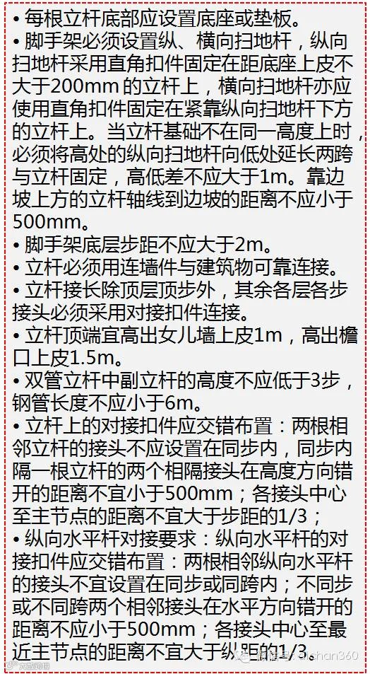 • 落地式扣件钢管脚手架应符合《建筑施工扣件式钢管脚手架安全技术规范》(JGJ130-2001)的相关要求。