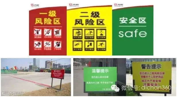 施工现场按风险系数分成一级风险区(红色)、二级风险区(黄色)、安全区(绿色)三个等级。不同颜色(红、黄、蓝)代表所处风险等级,并设置所处位置导向标识。