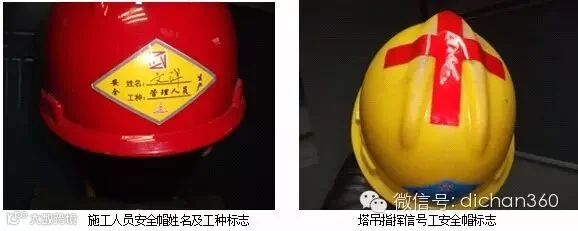 •施工单位管理人员统一佩戴红色安全帽,安全管理人员统一佩戴白色安全帽,施工人员统一佩戴黄色安全帽,特种作业人员统一佩戴蓝色安全帽。安全帽上应设有各个企业的名称和LOGO,施工作业人员安全帽信息栏(工作、姓名、照片、特殊工种作业证、安全培训证、技术交底证等)项目上每周组织一次安全检查、每月一次安全教育。