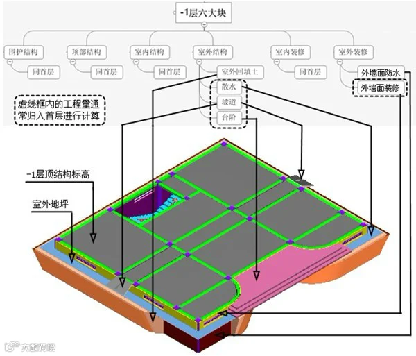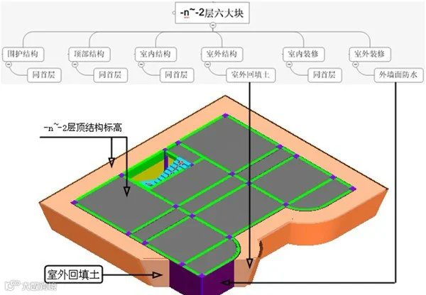 -n~-2层全部埋在地下,属于全地下室,其中围护结构、顶部结构、室内结构、室内装修所包含的构件同首层,室外结构变成了回填土,我们在基础层已经统计过了,室外装修变成了外墙防水,见图19。