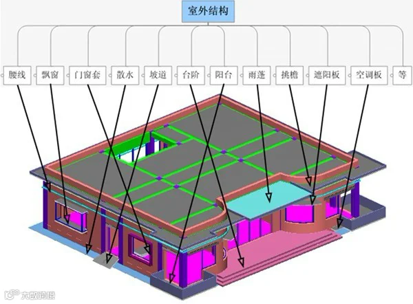 首层室外结构包含的构件可能有:建筑物腰线、飘窗、门窗套、散水、坡道、台阶、阳台、雨蓬、挑檐、遮阳板、空调板等外墙皮以外的构件,见图6。