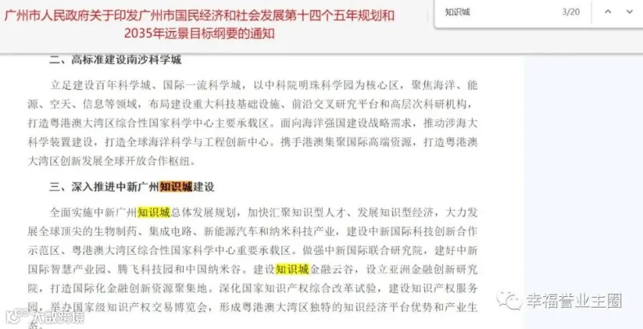 中新广州知识城,作为两国共建“一带一路”的新亮点,全国唯一经国务院批准的“知识产权综改试验区”,着力打造知识创造新高地、国际人才自由港、湾区创新策源地、开放合作示范区,将成为粤港澳大湾区高质量发展的重要引擎。在“十四五”规划中,到2035年,知识城将建成具有全球影响力的国家知识中心。成为粤港澳大湾区高质量发展重要引擎。