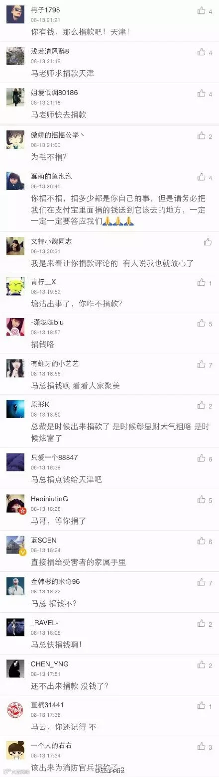 聚美优品的陈欧给天津爆炸牺牲的消防战士家属捐了500万之后,中国首富马云的微博下,浩浩荡荡出现了一批要求捐款的人。他们的理由理直气壮:“你咋还不捐款,中国首富,起码捐一亿啊”?“你有钱花12亿买别墅,没钱捐给穷困地区还有这次的天津爆炸事件?”“你要是不为天津捐款,迟早会身败名裂!”