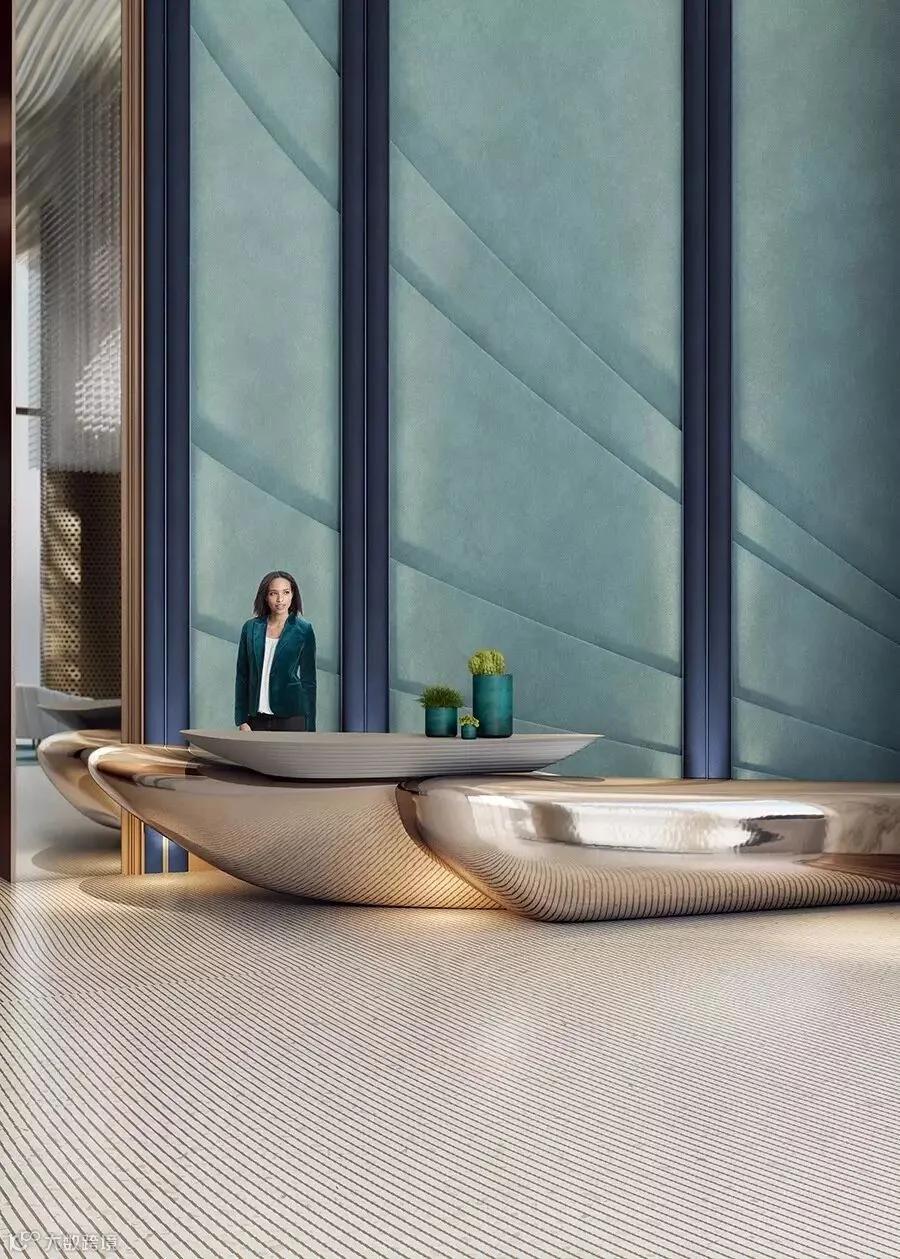 电梯入口的墙面采用带有弧形的皮革切面