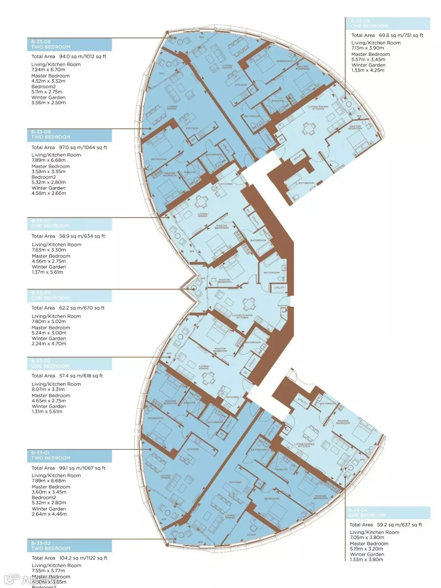 两房以上的户型都有冬季花园