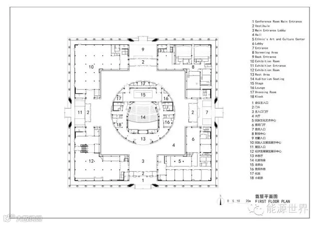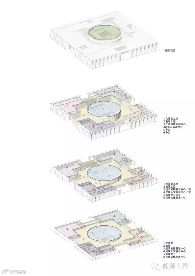 在建筑基座周围一圈设置精美、隽秀的花瓣形门洞并形成柱廊空间,象征中华56个民族团结、共融。