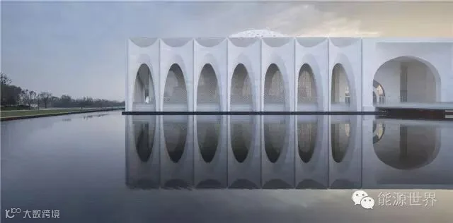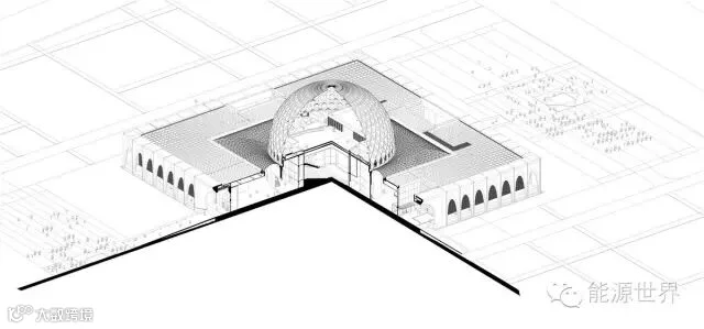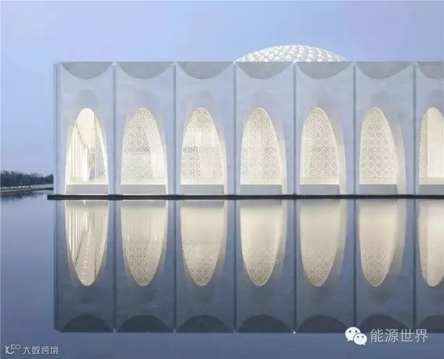 建筑以传统的清真寺为原型,通过新的材料和技术,以微妙的方式来演绎清真寺的空间结构:四周环绕的拱券从下到上逐渐收分形成优雅的弧线。当整栋建筑倒影水中,弧形的花瓣形拱券更显清晰灵动,散发出优雅气质。建筑的穹顶不是简单复制伊斯兰的符号,而是一种抽象和转译。我们以一系列花瓣状的壳体构成穹顶,创造性地将内部空间变为半室外的屋顶花园,融合了阳光、空气和绿色。