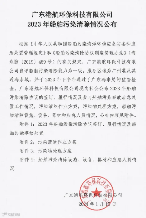 广东港航环保科技有限公司2023年船舶污染清除情况公布