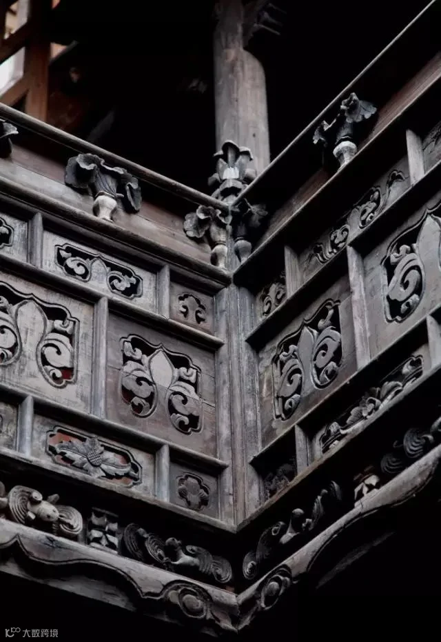 木雕艺术在古建筑中所独具的装饰作用不容忽视,雕梁画栋,雕饰门楣、屋椽、窗格、栏杆、飞罩挂络……木雕所至之处,可以古朴典雅,也可以富丽堂皇,文人、商户、贵族都喜欢通过木雕来修饰宅院。