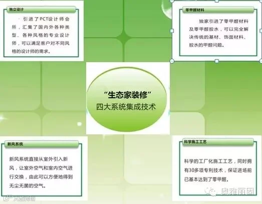 即:通过专业设计、控制无污染材料、科学施工工艺、新风技术四大系统的集成,并在空气检测、施工监理机构的全程监控下完成项目实施,并树立室内空气趋于零甲醛含量的装饰行业全新标准 的 一种全新“装修集成技术”。