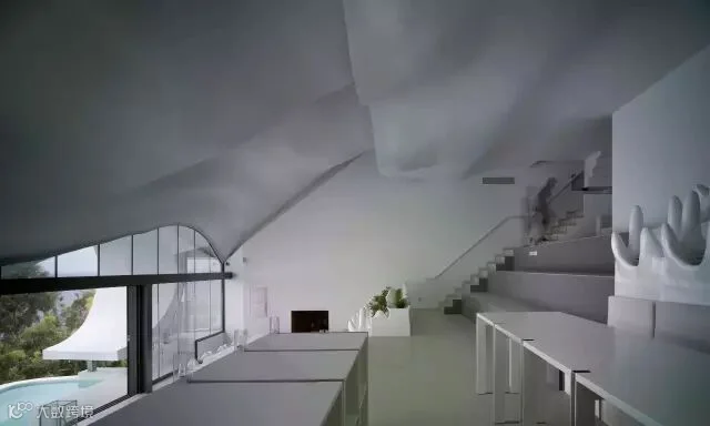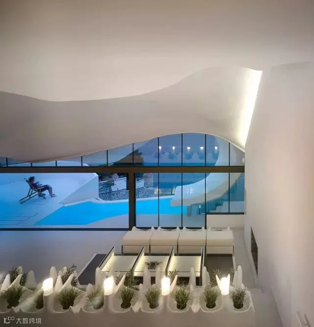 屋顶的形式让内部形成一个洞穴状的空间,这个设计灵感来源于西班牙著名建筑师高迪的作品。这个钢筋混凝土浇筑的两层框架是整个房子的支撑,内部不再需要柱子,这让房子内部的视野非常好,同时也有利于海上吹来的气流进入室内。