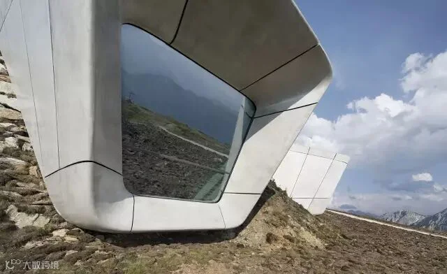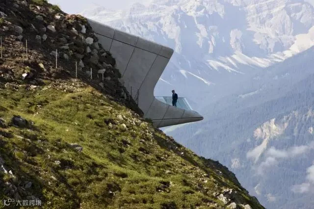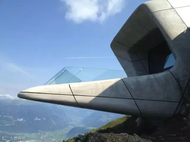 这座山巅博物馆是由今年刚去世的著名现代建筑师扎哈·哈迪德 (Zaha Hadid) 所设计。扎哈的设计很好地诠释了梅斯纳尔博物馆的理念——游客从一侧的入口进入到嵌山体中的博物馆,洞穴式的内部空间共有三层展厅,通过电梯连接,设计团队形容这些电梯为山涧的瀑布;最后游客从另一侧出来,在三个不同朝向的观景台上享受底下的山谷和周围的群山的壮丽风景。