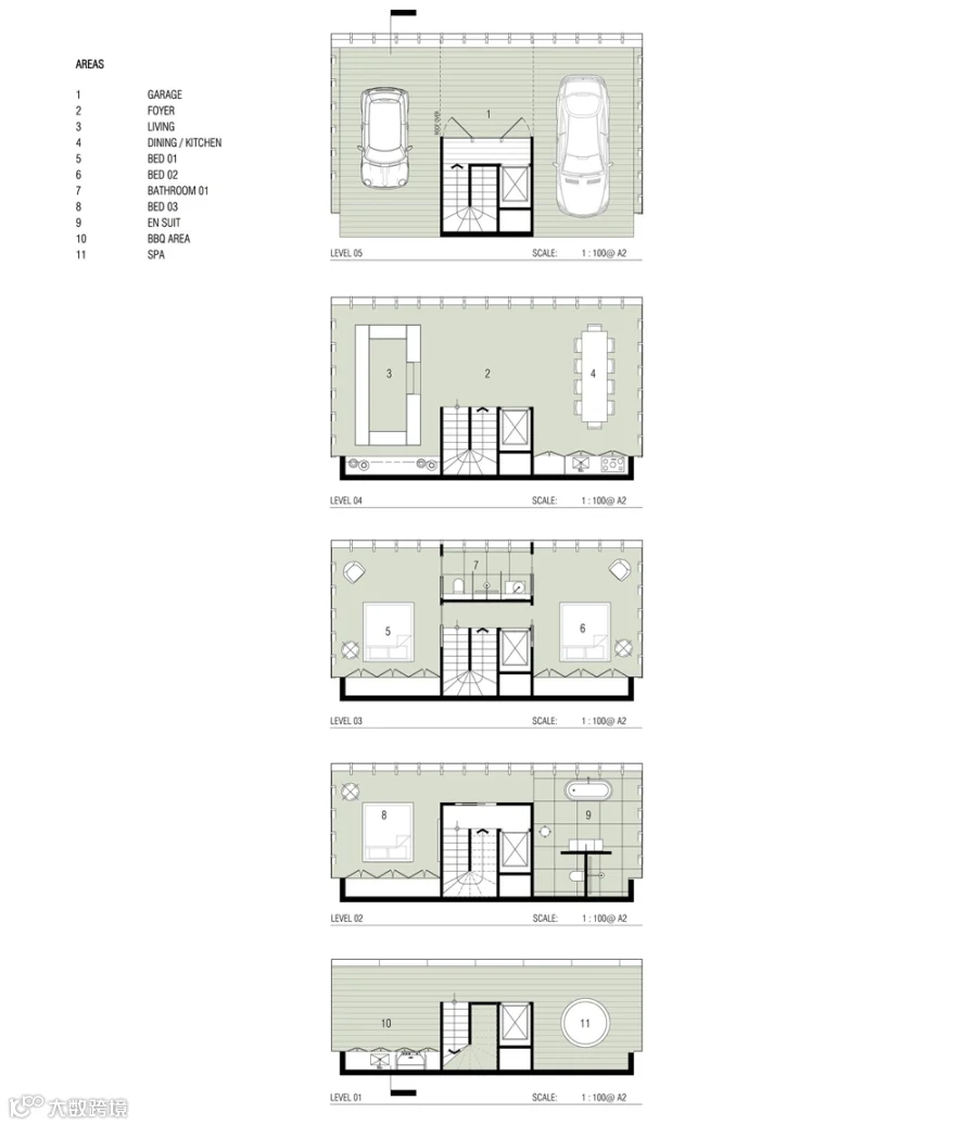顶层与地面处于同一水平线上,是包含两个停车位的停车场,剩余四层用于居住,上面是厨房和客厅,下面是三个卧室和两个浴室,最底层的露台上还有个浴池,整个建筑越往下的空间越私密。建筑的中部是楼梯和电梯,除了用于上下楼,还可以作为隔断将每一层左右两边划分为两个不同区域。