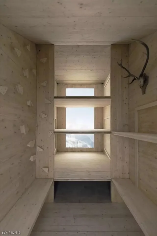 整个室内面积只有9.7㎡,装修非常朴素,主要以功能性为主,唯一能看到的装饰就是墙上挂着的一对鹿角。屋内分为三层平台,可最多容纳9个人休息,透过面向山谷的大型全景窗,可以欣赏屋外的壮丽景色。而小屋所处的这个地点还能够360°俯瞰意大利和斯洛文尼亚,尤其赞的是能欣赏到斯洛文尼亚最高峰特里格拉夫峰和亚得里亚海的美景。