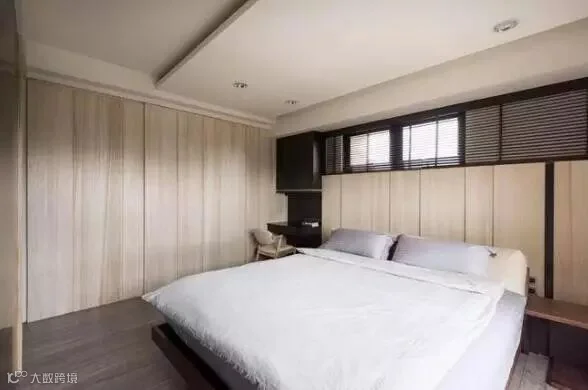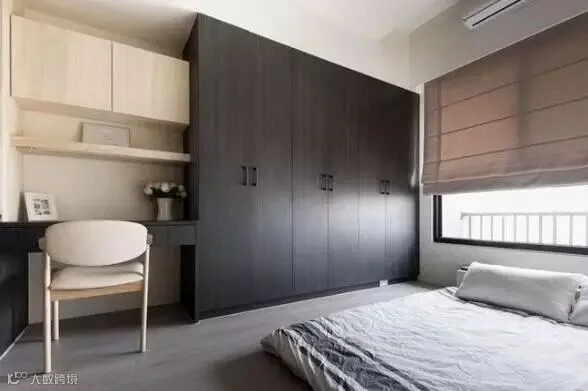 第二张图,是设计师定制的到屋顶的整体衣柜,衣柜线条与天花线条合二为一,纵向延伸没有被阻断,所以视觉上会显得层高高一些。