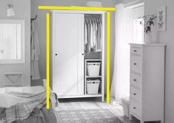 第一张图是宜家的样板间,这个衣柜是我们常常购买的成品衣柜,大约2.1-2.4米高,竖向线条被衣柜线条中断,纵向视觉延伸被阻断(查看标注的黄色线条)。
