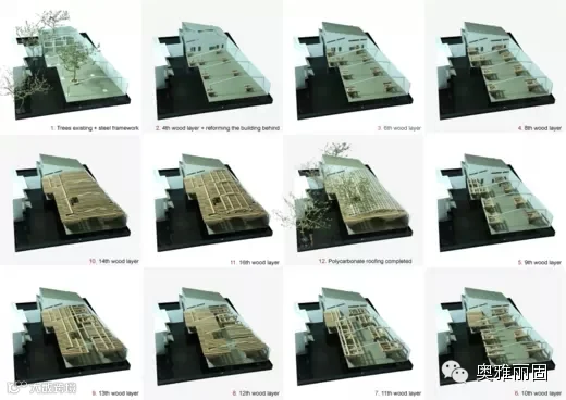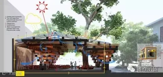 由一个挨着一个的“木材”垂直堆叠,逐渐向上,形成一个“树根”,“树根”继续交替地生长,形成稳定的框架,并且利用屋顶创造各种各样的阴影形式,这种形式有助于减少热量吸收。屋顶中央是空气层,通过水喷射系统连接雨水收集槽,自动冷却和清洁。