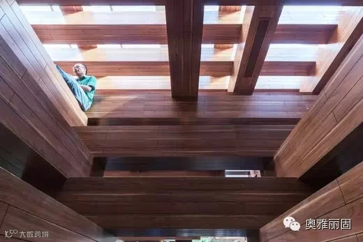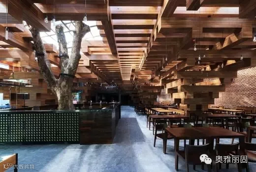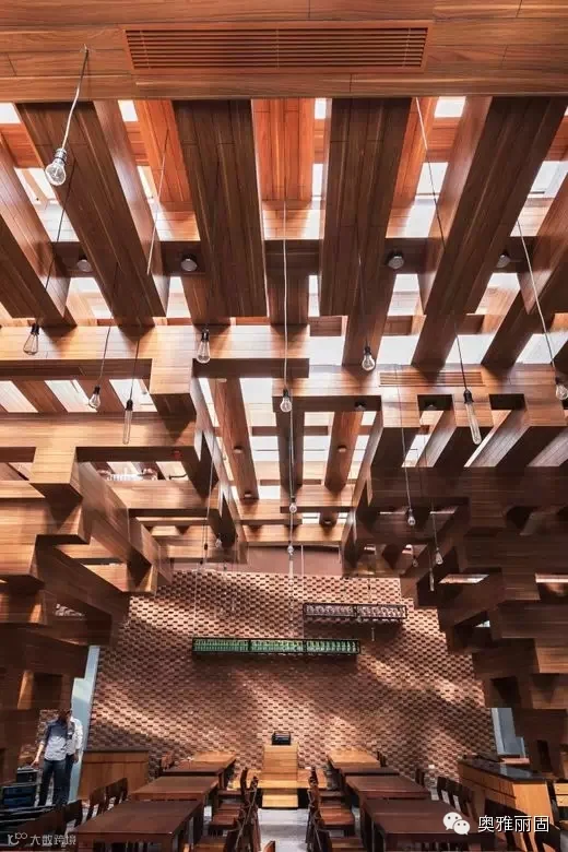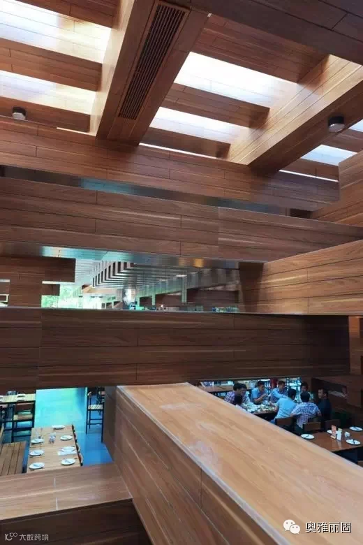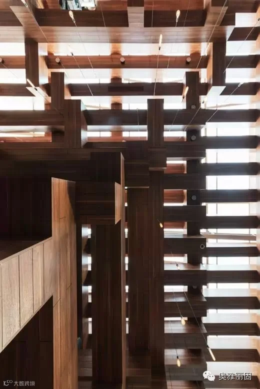 根据绿色建筑的要求,最大的与古树的切合,以“木材”与“树根”为元素,三维立体空间划分。