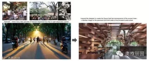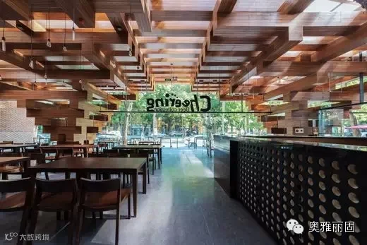 Cheering餐厅是沿着人行道而建设,每天都上演着人们一系列的日常活动,特别是从白天到夜间的烹饪活动,这些都激发了设计者的灵感去创造一个空间,来唤起人们对古树的回忆——存在于这座千年古城大街小巷中的一个熟悉印象。