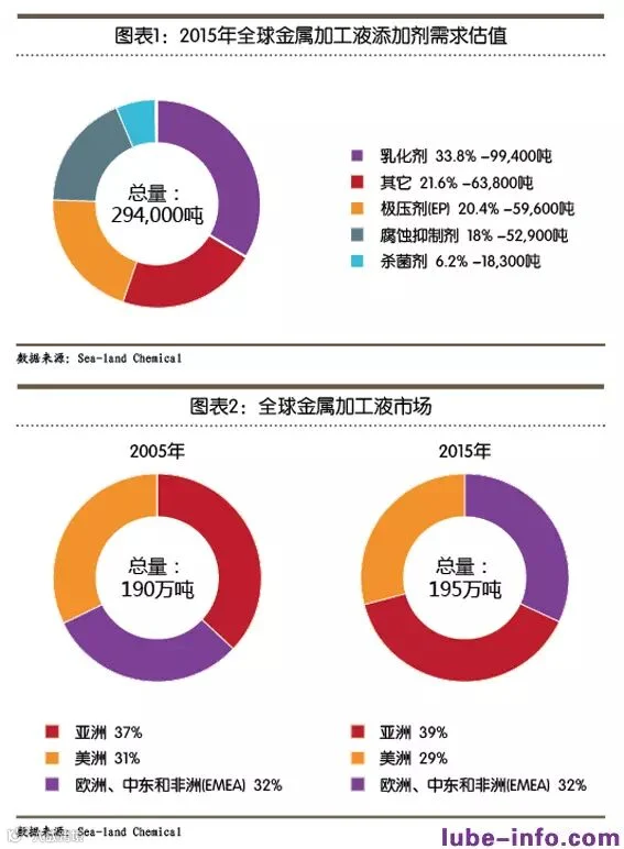 金属加工液的增长能够直接反映润滑油市场的发展趋势,虽然增长原因可能会略有不同。亚洲一直是市场增长的中坚力量。本世纪初一些汽车制造商向东欧转移,在很长一段时间影响着欧洲的工业发展,尽管目前这种影响已经消退。金属加工液的添加剂和原料市场占市场总量的15%左右,全球市场总规模在30万吨以下。在这一领域,超过50%水基金属加工液添加剂技术业务都以乳化剂、缓蚀添加剂为主。