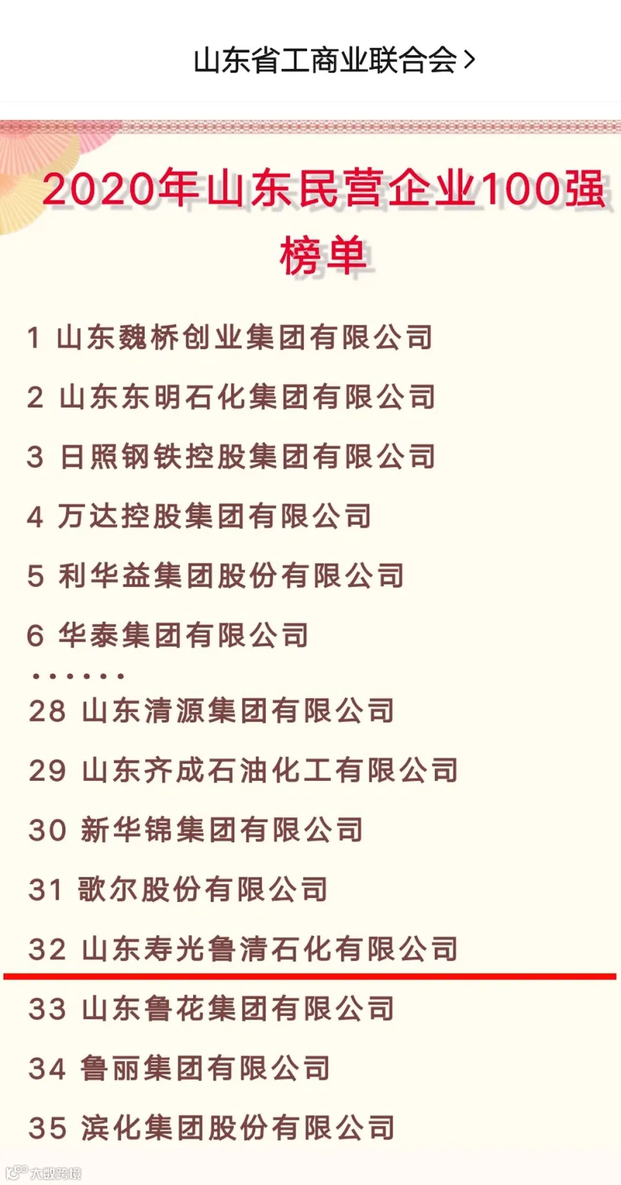 现已按规定程序完成了企业申报、部门推荐、审议初评等程序,形成“2020年山东民营企业100强”榜单。鲁清石化上榜名列第32位,较去年上升11位。