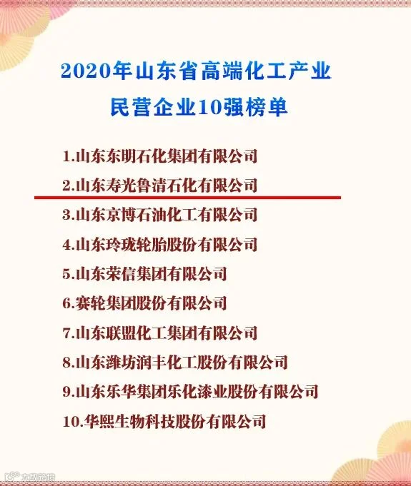 现已按规定程序完成了企业申报、部门推荐、审议初评等程序,形成2020年山东省“十强产业”民营企业10强榜单。鲁清石化上榜位居第二位。