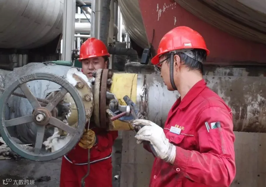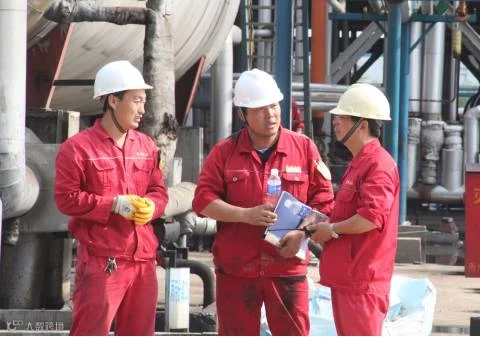陈总在催化检修现场与侯主任、曹主任交流讨论工作事项