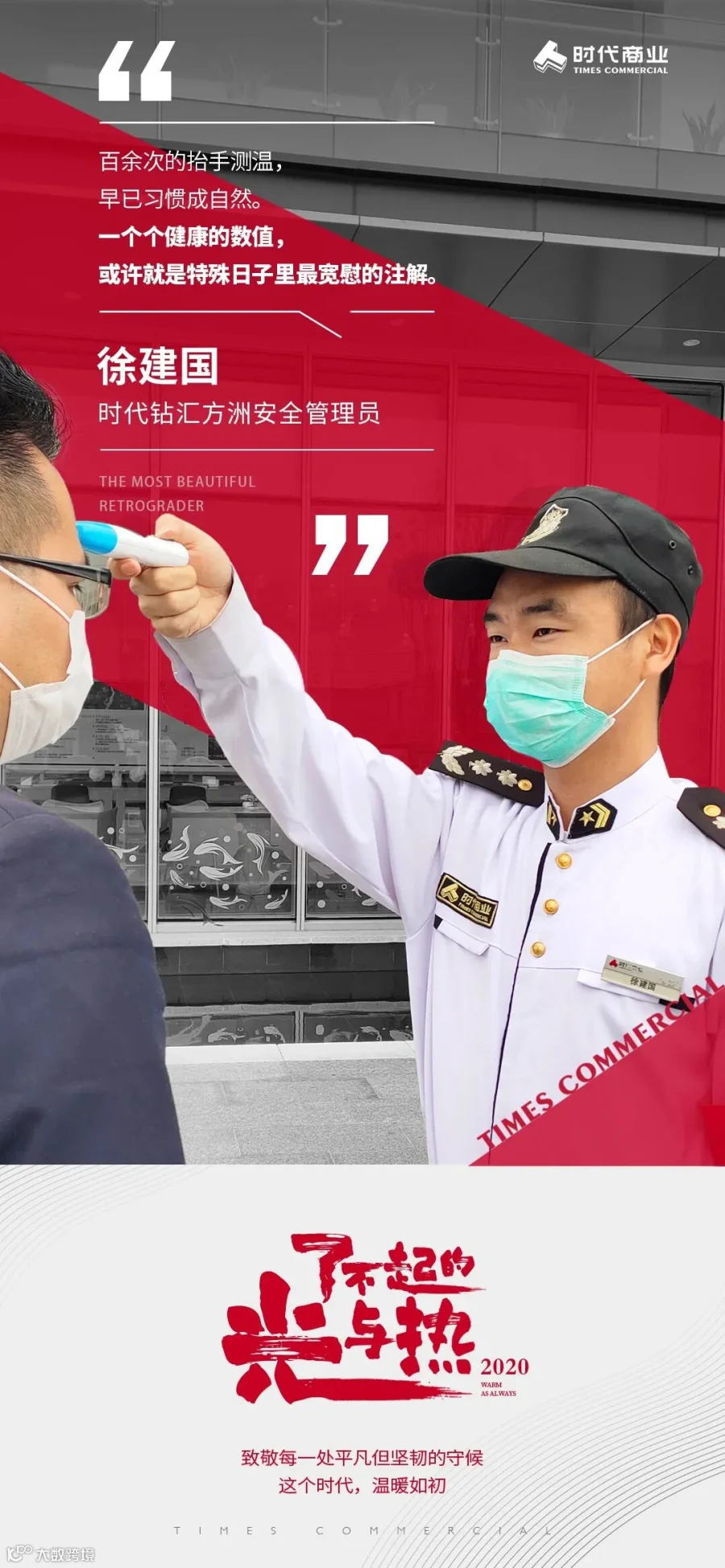 一线疫区之外,在时代商业各项目的防疫战场,时代商业人用坚定的守候回应无情的灾难。他们躬身入局,善良有爱,始终与客户守望相助,共渡难关。点滴经历或许不那么波澜壮阔、感天动地,但这些坚韧而温暖的力量,折射出时代前行的印记。