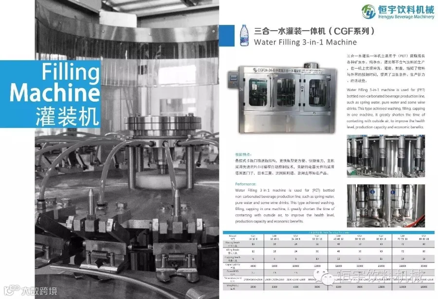 这台机器是用于PET瓶装矿泉水、纯净水、苏打水等的灌装,在一机上实现冲洗、灌装、旋盖,缩短了物料与外界的接触时间,提高了卫生条件、生产能力、经济效益。产量从3000BPH-36000BPH。