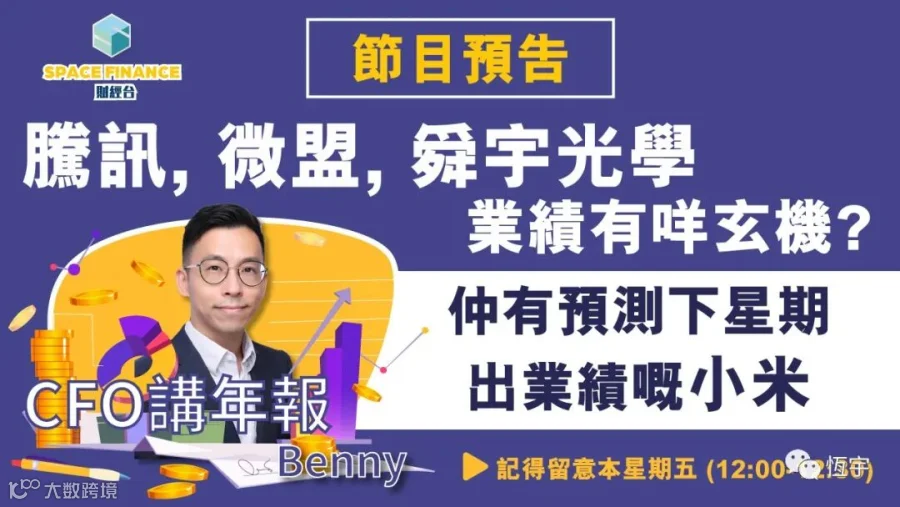 Benny將會在《CFO講年報》節目上深入分析騰訊(700)、微盟(2013)和舜宇光學(2382)的業績,到底股份值不值得趁低吸納,還是仍有下跌空間?