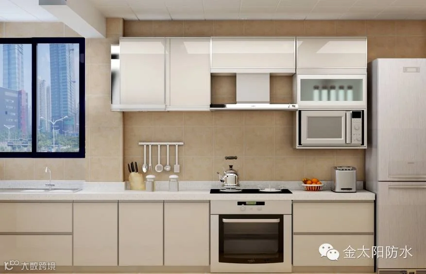处理方法:地面、操作台面的材料应不漏水、不渗水。墙面、顶棚材料应耐水、可用水擦洗。橱柜内部设计的用料必须易于清理,最好选用不易污染,容易清洗、防湿、防热而又耐用的材料,像瓷砖、金太阳防水涂料、PVC板、防火板、人造大理石等都是厨房中运用得最多的安全材料。