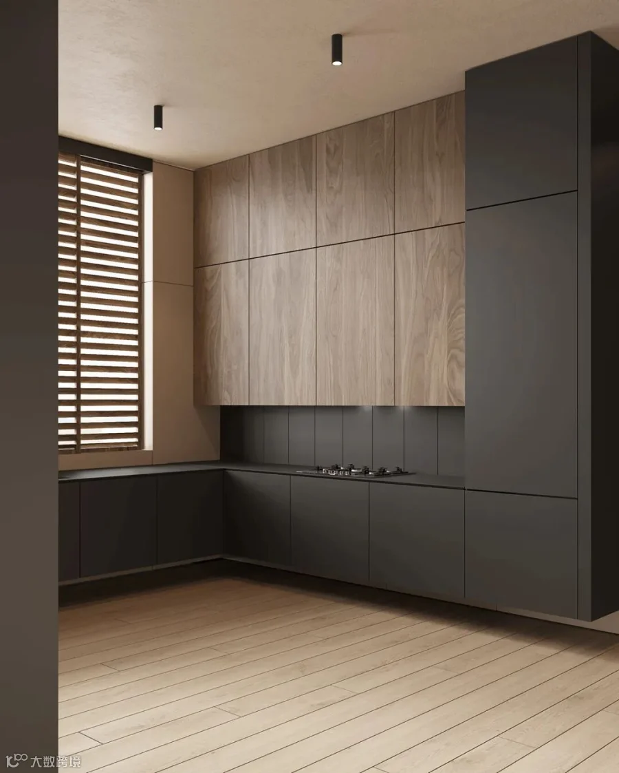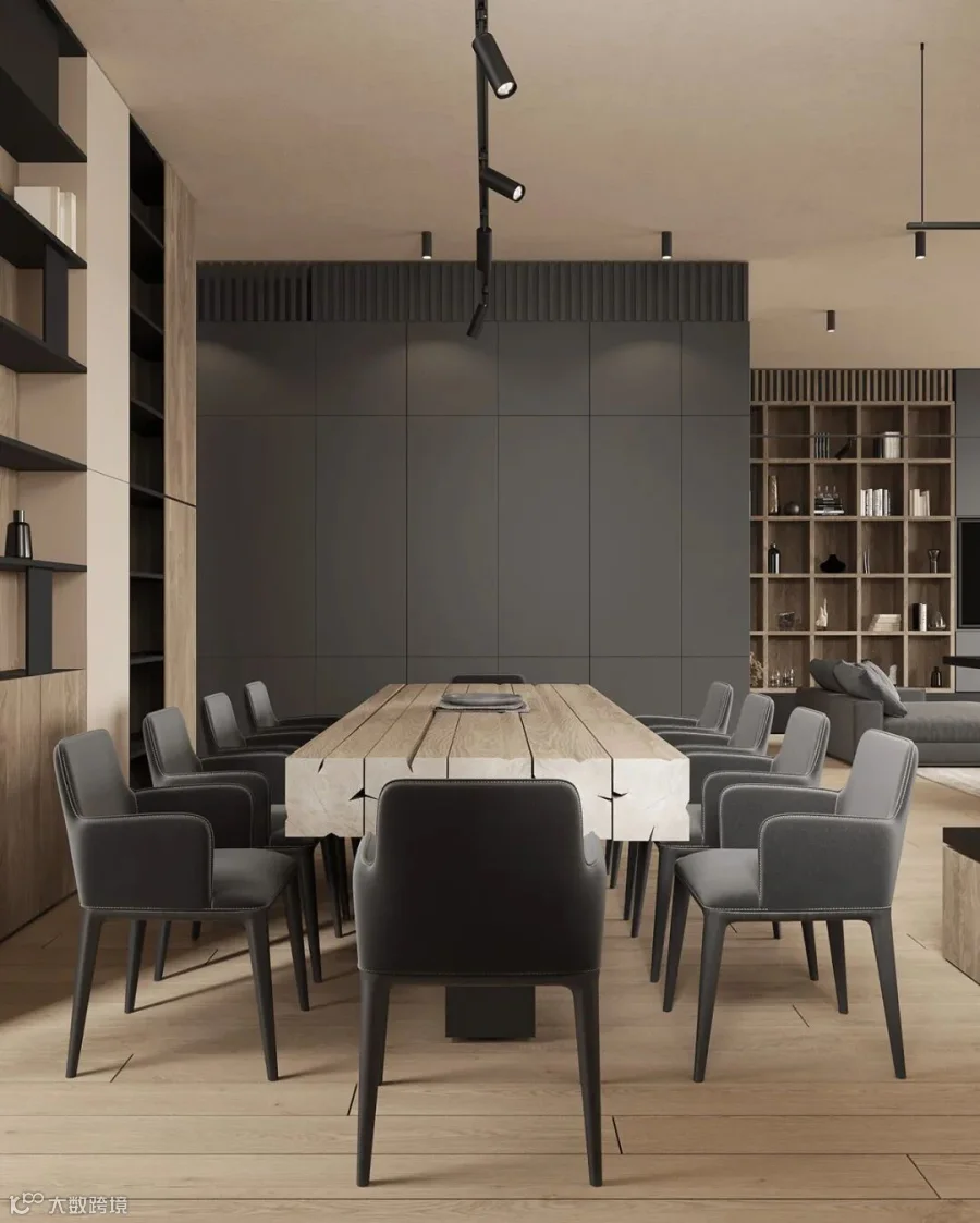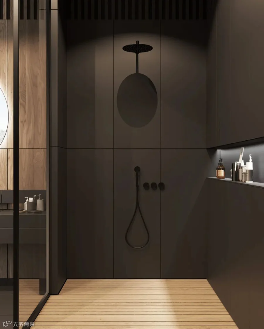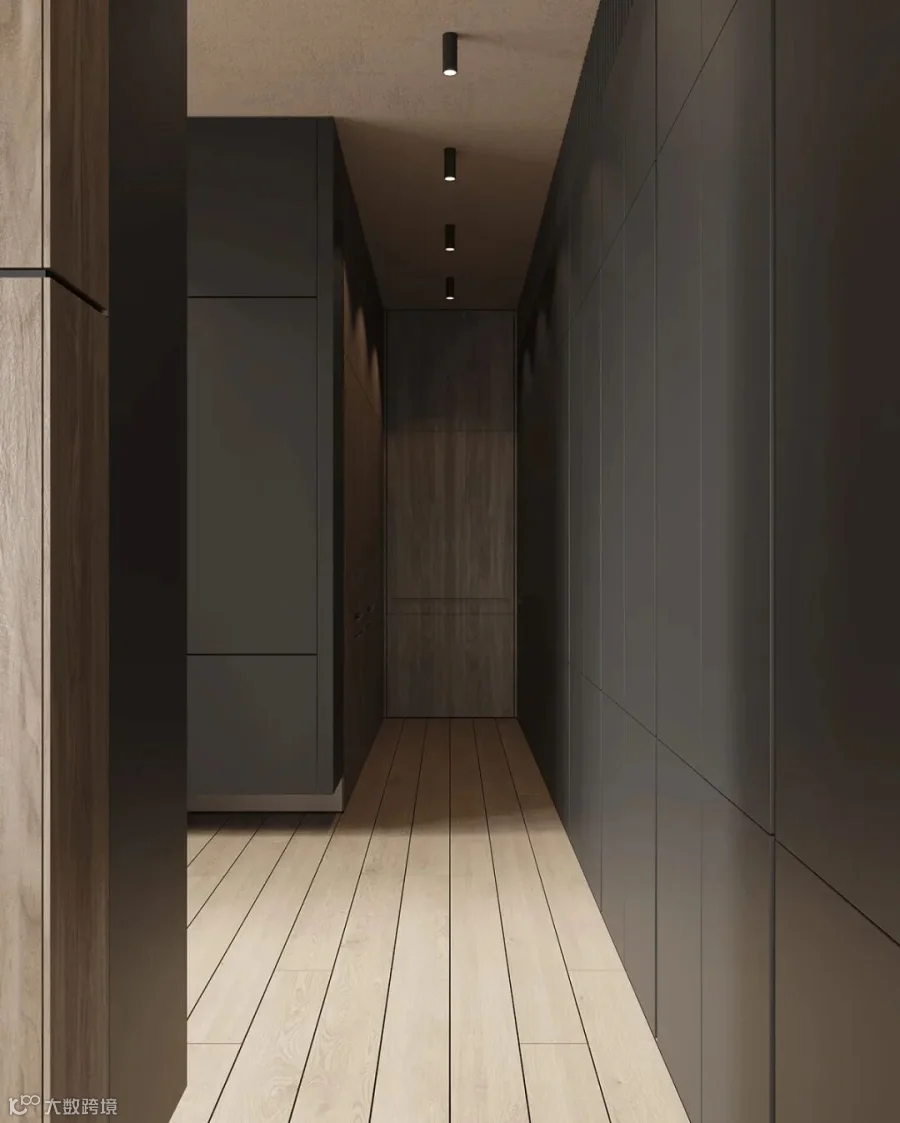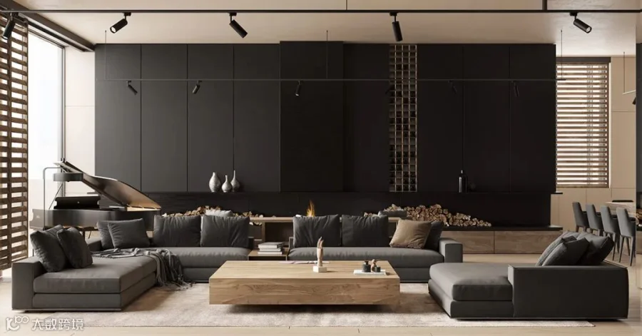 在这间大型豪华公寓中,黑色和木质色调形成了鲜明的对比。从客厅到卧室、浴室和储物空间的走廊,相同的颜色、纹理和材料贯穿每个空间。还有一个漂浮的家具主题,以浮动效果的咖啡桌、浮动的厨房。感受别样的宁静深幽,享受远离喧嚣的恬静。
