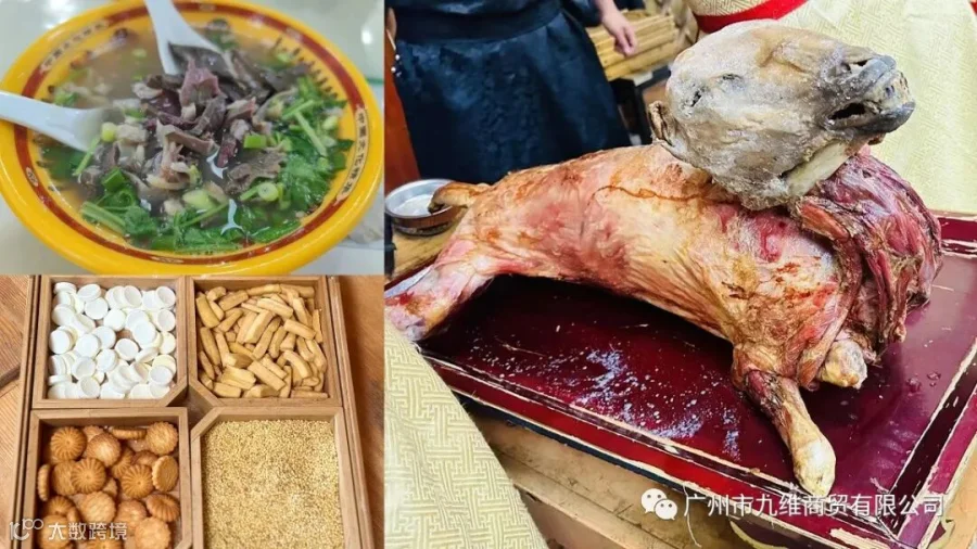 能迅速将人从仙境拉回世俗的,唯有美食,一旁的蒙古包里,盛宴刚刚开场,火热氛围中,我们选出的两队蒙古王爷王妃,在蒙古歌舞中,为大家亲手切烤全羊,烤全羊外焦里嫩,皮脆肉滑,色泽金黄,一众老饕们大饱口福.