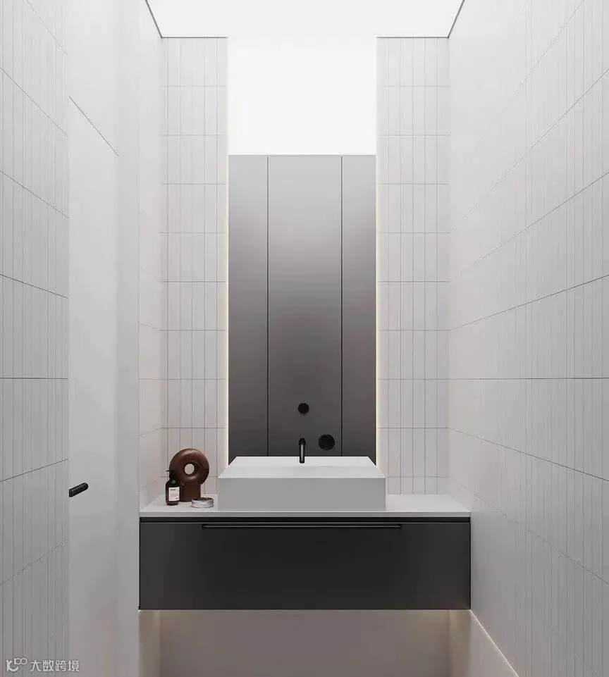 次卫的瓷砖铺贴十分整齐,洗手台上的艺术摆件又让空间变得活跃起来。