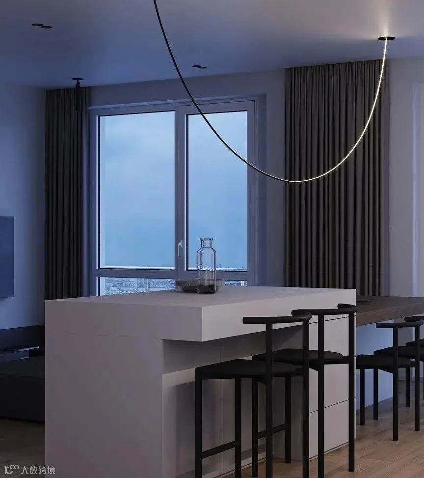 设计师对照明的设计有着自己的想法,隐形灯带铺陈大面光感,而极简灯具则呼应了设计主题。