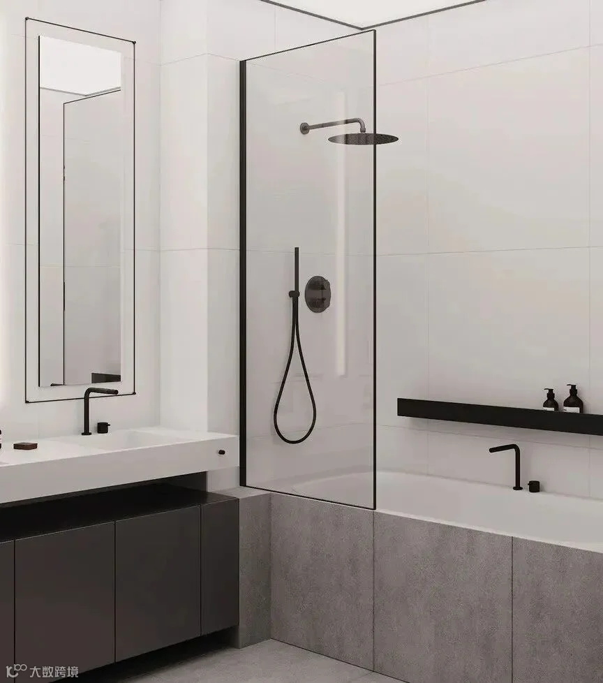 卫生间利用沉稳黑色做点缀,构绘出轻快明亮感。淋浴区与浴缸之间,用透明玻璃形成干湿分离。